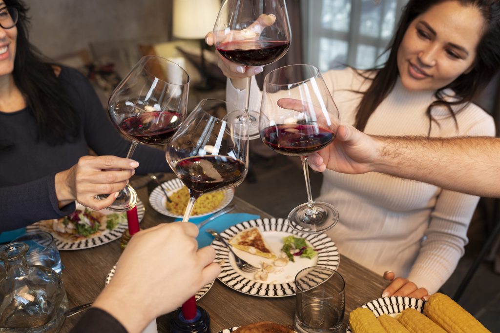- Pahare de vin – minim unul de persoană, ideal câte un pahar pentru fiecare vin. Folosiți pahare de vin adevărate, se găsesc și sunt accesibile, nu „lalele” turcești, nu pahare cu buza groasă, din sticlă groasă;