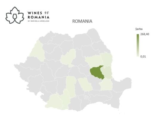 The Sarba grapevine variety is grown exclusively in Romania, on an area of 319.65 ha [ONVPV, 2022], compared to 284 ha in 2010 (VIVC), which means that Romanian winegrowers have also turned to local varieties through reconversion programmes.