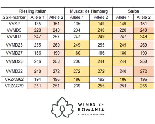 Genetic comparison between Riesling italian – mother and Muscat de Hamburg – father and Sarba, according to VIVC