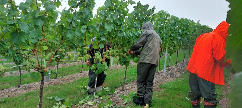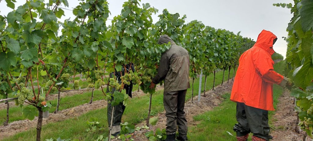 In South East England (Kent, East and West Sussex, Surrey, Hampshire and the Isle of Wight) there are 1500 hectares of commercial vineyard plantings. Champagne vines are planted in this area because it suits the soils – Chardonnay, Pinot noir and Pinot Meunier! And even though the vineyards are growing year by year, manual handling is desired for the best quality of these grapes to make the best wines! Therefore, labor shortages cannot be afforded as the quality of the vintage will be compromised.