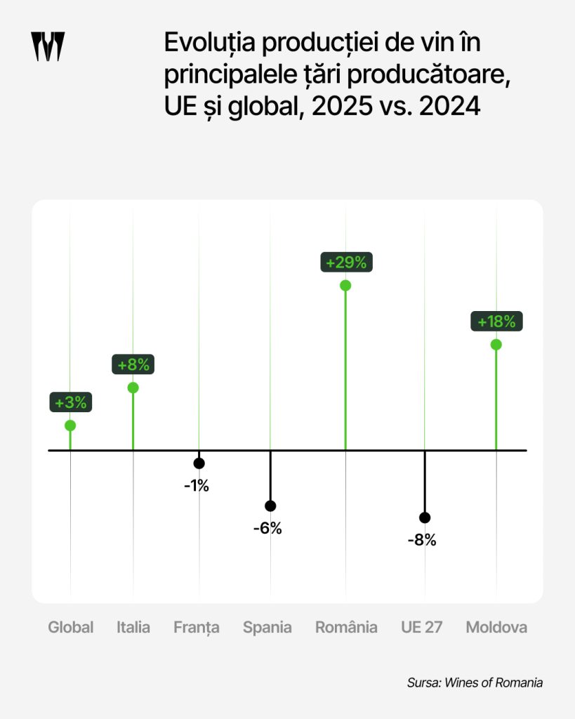 Potrivit raportului anual al Organizației Internaționale a Viei și Vinului (OIV), analizat de Wines of Romania, producția globală de vin a înregistrat în 2025 un avans de 3%, fapt ce marchează doar o recuperare modestă, după recolta extrem de slabă din 2024. Volumul total estimat pentru 2025 este de 232 de milioane de hectolitri, cu 5% sub media ultimilor cinci ani. România se numără printre puținele țări care înregistrează o creștere semnificativă, după un 2024 extrem de secetos și afectat de fenomene meteorologice severe.