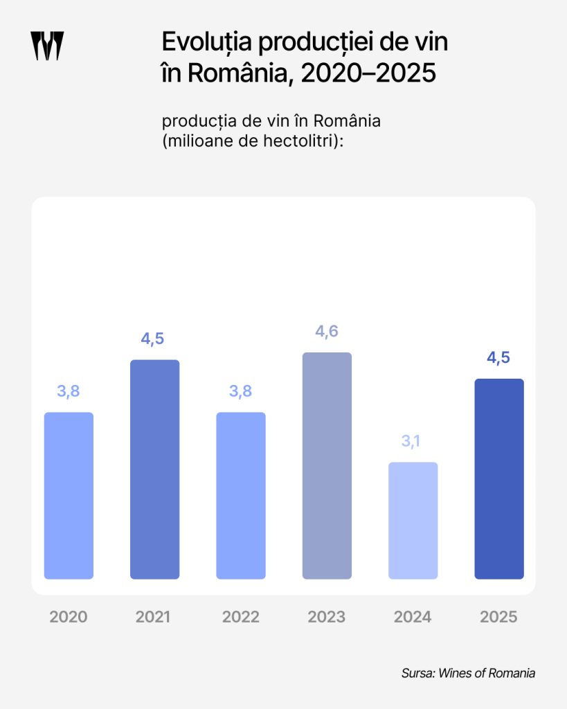 Pentru România, estimările pentru producția de vin din 2025 indică un total de 4,1 milioane de hectolitri, cu 29% mai mult decât în 2024, când au fost produși 3,1 milioane de hectolitri, și cu 3% peste media ultimilor cinci ani. Deși primăvara a fost marcată de geruri târzii, urmate de episoade de grindină și o vară secetoasă în anumite zone, România a beneficiat de o toamnă excelentă, cu diferențe de peste 10°C între zi și noapte, dar și cu ploi înainte de recoltă, condiții care au contribuit la struguri de calitate în mare parte din țară.